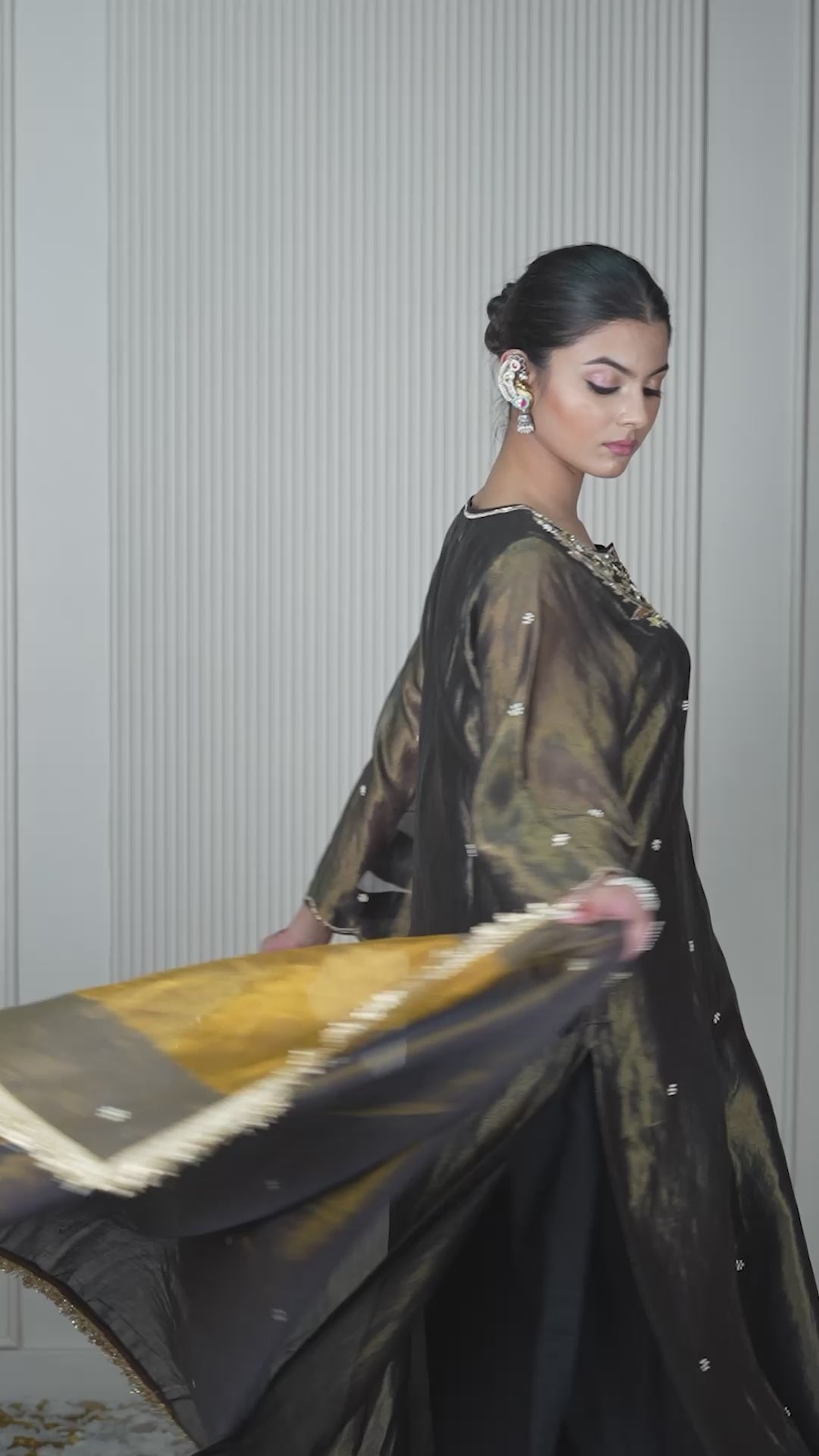 Elegant Black kurta Set, heavy handwork embroidered neck in buti kurta with beautiful key whole neck, cotton silk pant with patch in buti embroidery, and a handloom tissue dupatta in vintage buti work with golden lace, perfect for weddings and festive occasions.