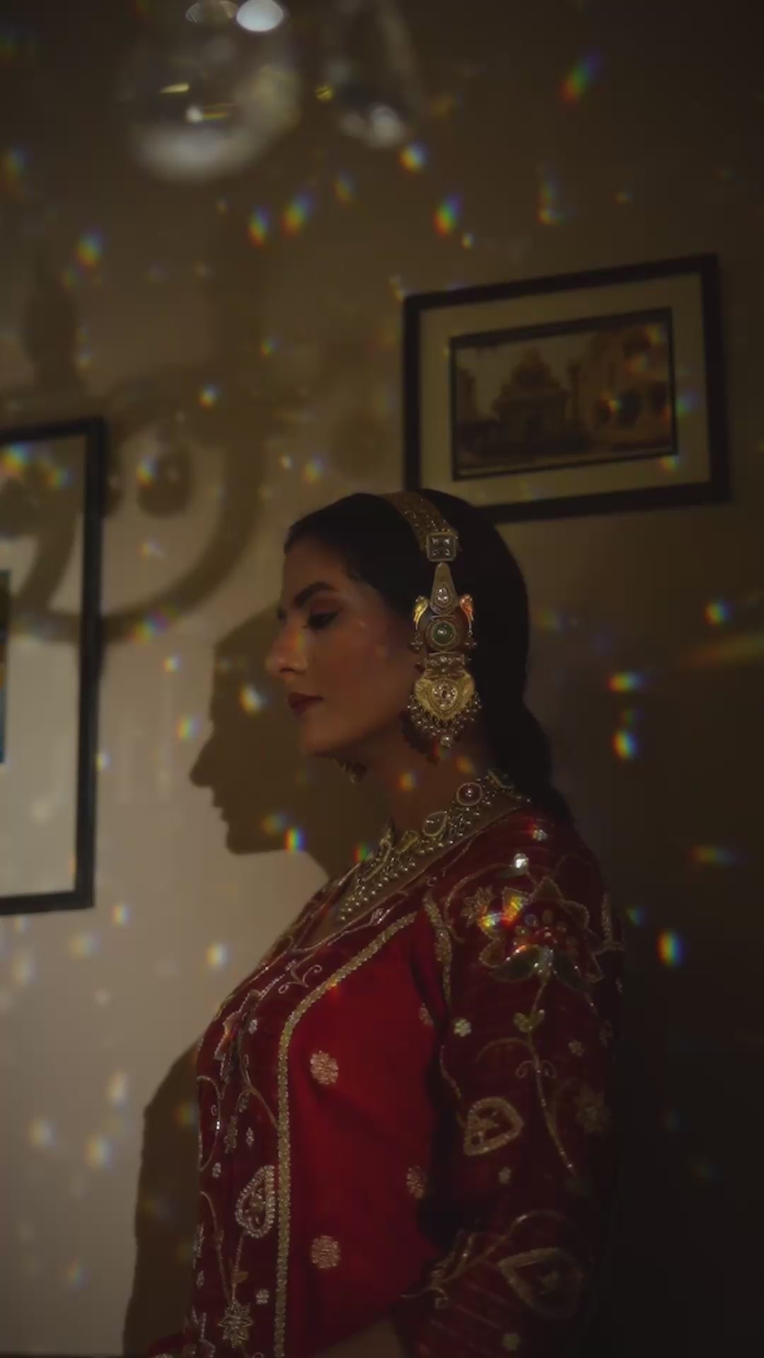 Elegant Dark Red lehenga set featuring a long blouse style embroidered with beautiful jhal work, kalidar pure silk lehanga with hand woven banarasi buttis, and a organza dupatta with golden lace, jhal vintage embroidery including zari dabka and sequice, every inch reflecting artisnal mastery, perfect for weddings and festive occasions.